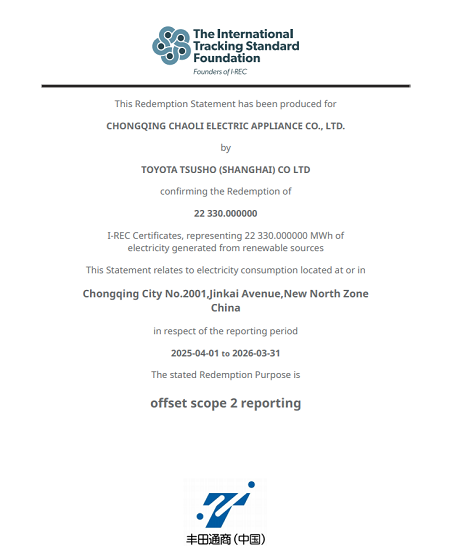 繼我司獲得市級綠色工廠后,配合DENSO碳中和規劃,我司已獲得I-REC證書,并購買了覆蓋公司電力以外排碳量的碳積分數量。
